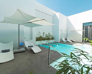 Шикарная вилла рядом с пляжем, включает 2 спальни (с кроватью king-size и двумя кроватями twin), гостиную с обеденной зоной на 8 персон, 2 ванные комнаты с ванной и душем, гардеробную, душ на открытом воздухе, террасу с бассейном, беседкой-шатром, зоной отдыха и обеденной зоной, частного сада и с выходом к Персидскому заливу.